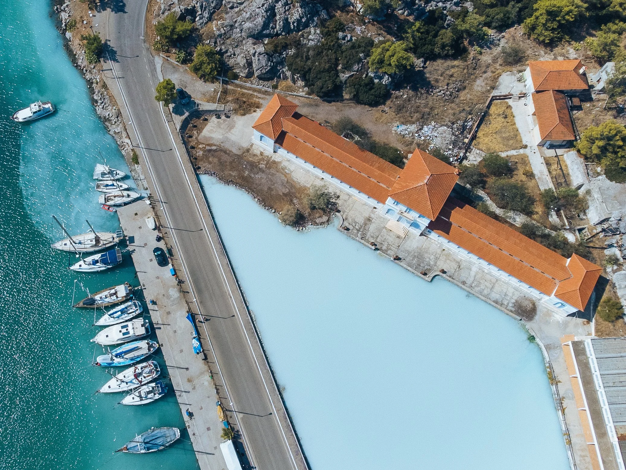 At the same time it is considered one of the most important geothermal fields in the country and is also famous for its thermal baths. There are 3 springs, the most famous being the one at the entrance of Methana town. Here the water gushes out rich in hydrogen sulphide from cracks in the white limestone, into a small lake which communicates with the sea. The temperature of the water varies between 27,0 °C and 34,4 °C. If you can get over the really strong smell—which I wouldn't characterise as pleasant—it's worth swimming here, if just to have the experience.